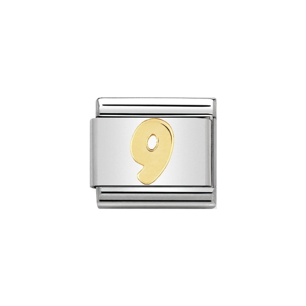 Original Charm for Nomination's Composable Classic Bracelet with Number 9 in stainless steel and bonded yellow gold. Available Charm versions: 0-9. Made in Italy. What's your favourite number? Add a special Charm to your bracelet.