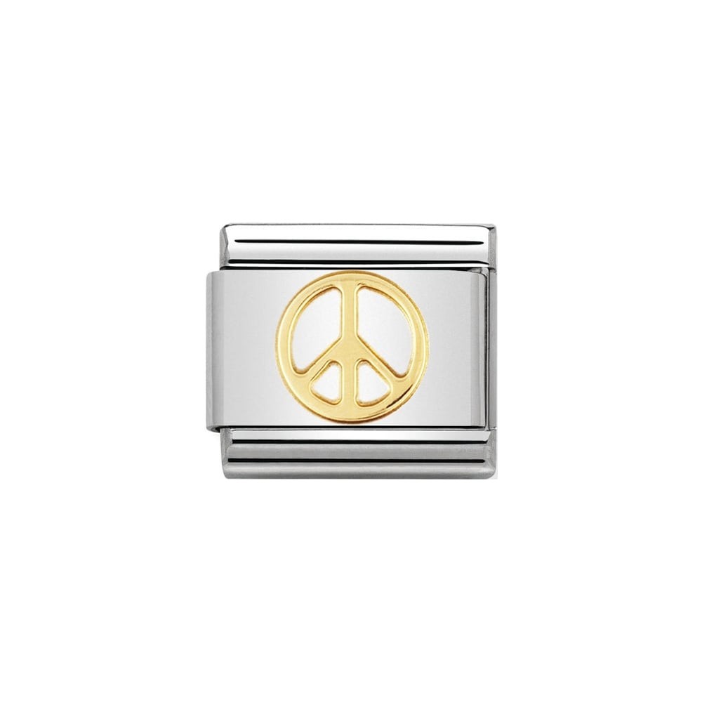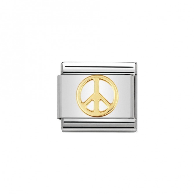 Original Charm for Nomination's Composable Classic Bracelet in stainless steel and bonded yellow gold with Peace symbol. Made in Italy. Share your message of peace with the world.