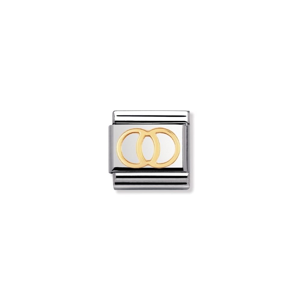 Original Charm for Nomination's Composable Classic Bracelet with Wedding Rings symbol in stainless steel and bonded yellow gold. Made in Italy. Celebrate your Wedding Anniversary with a special Charm.