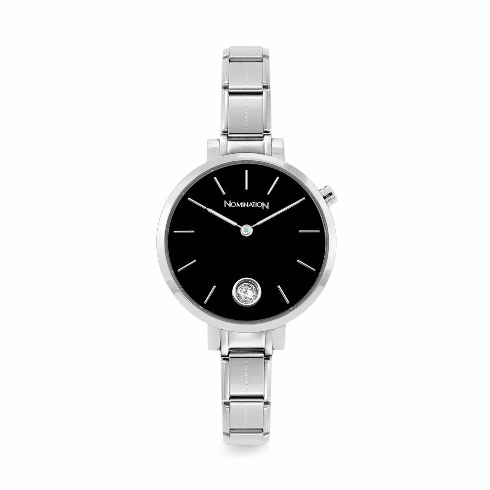 Composable Time Collection Watch in stainless steel with Sunray Black clock face with Cubic Zirconia. Clock face diameter: 3.1 cm. The watchstrap can be personalised with Original Composable Classic Charms. Made in P.R.C. Strong and smart, this striking timepiece has it all.