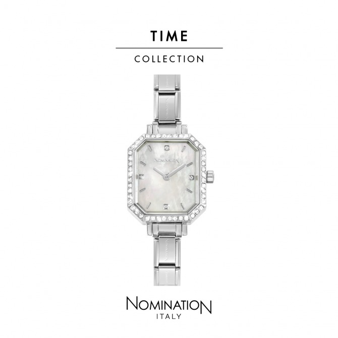 Stainless steel watch with white Cubic Zirconia. Band width: 0.8 cm. Stainless steel case and Mother of Pearl dial. Waterproof: 3 bars. Case size: 2.3 x 2.7 cm. You can personalise the watchband with original Composable Classic Links. Made in PRC. Gift this watch to a true diva!