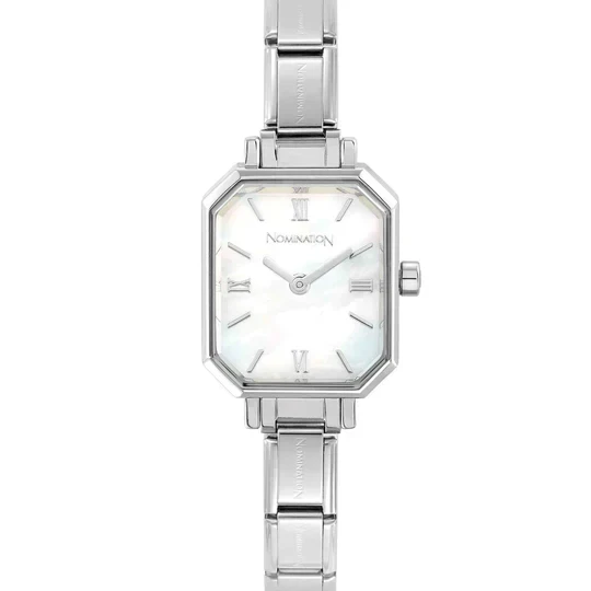 Watch with Composable Classic Bracelet (Charm height = 0,8 cm). Case in stainless steel and dial in Sunray stainless steel. Water resistant 3 bars. Case size: 2 x 2,5 cm. The watchstrap can be personalised with Original Composable Classic Charms. Available dials: mother of pearl, black, pink, and white. Time Collection. Made in P.R.C. Choose your favourite dial and flaunt your watch at all hours of the day or night!