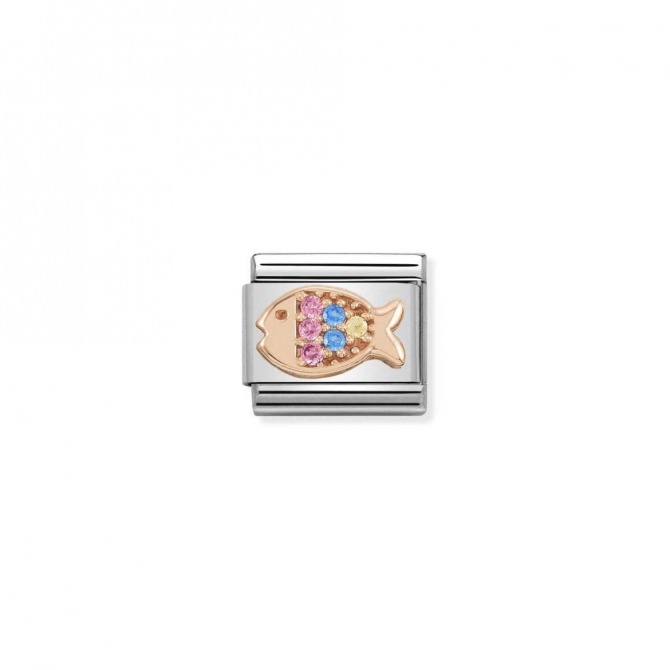 Stainless steel charm for original Nomination Composable Classic bracelet with coloured Fish, details in bonded rose gold and pink and light blue Cubic Zirconia. Made in Italy. Scuba divers can't live without this colourful fish on their bracelet.