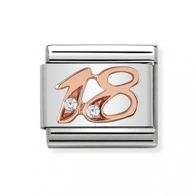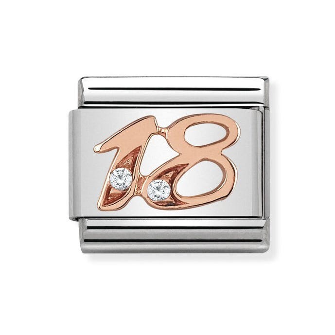 Original Nomination Charm for the Composable Classic bracelet in stainless steel, bonded rose gold and Cubic Zirconia with the Number 18. Made in Italy. Congratulations on turning 18! Remember this birthday with a special Charm!