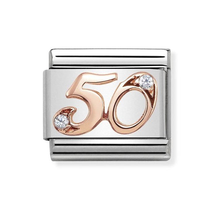 Original Charm for Nomination's Composable Classic bracelet in stainless steel, bonded rose gold and white Cubic Zirconia with the Number 50. Made in Italy. Make a friend's birthday unique with Composable.