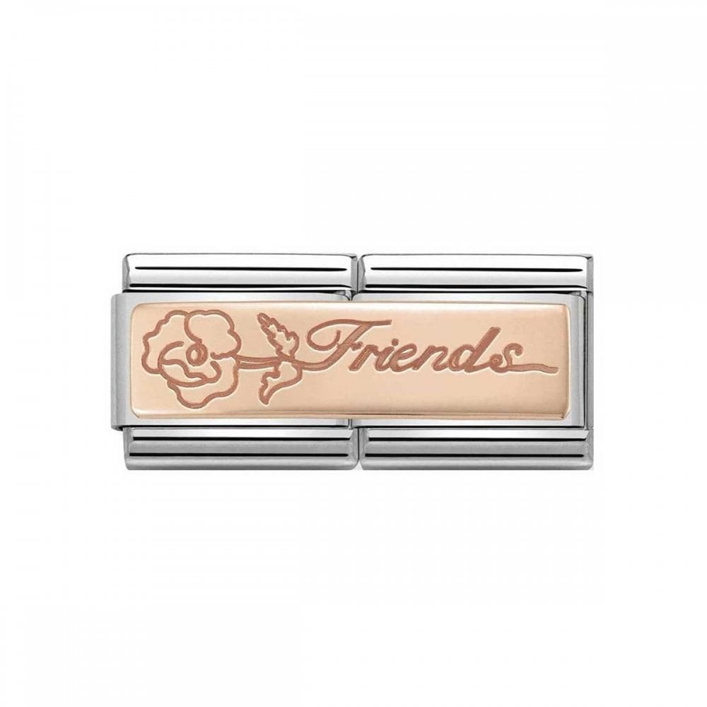 This beautiful double link charm features a 9ct rose gold plaque with 'friends' text and a floral engraving.