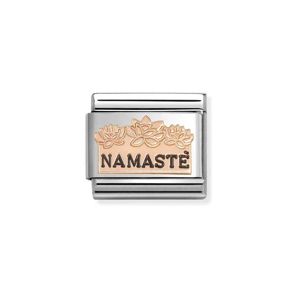 Original Nomination Classic Link in stainless steel with NAMASTE text with flowers symbol in bonded 9ct rose gold with black enamel.