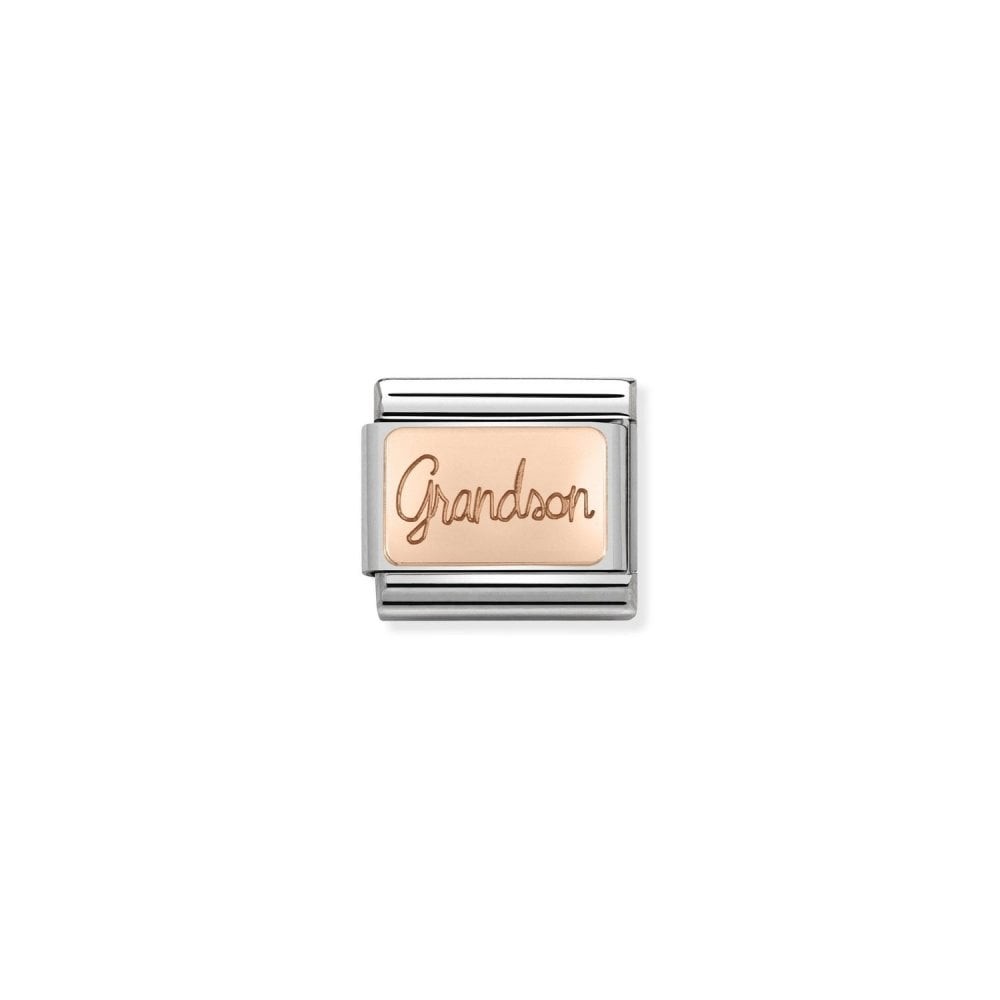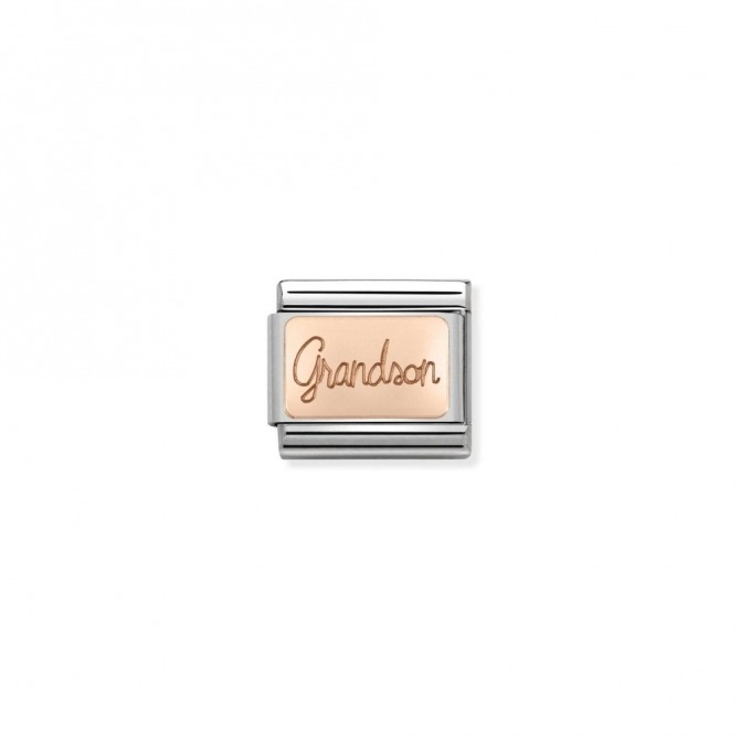 Original Charm for Nomination's Composable Classic bracelet in stainless steel and bonded rose gold with “Grandson” engraved. Made in Italy. Have a beloved grandson? Add this special Charm to your Composable bracelet.