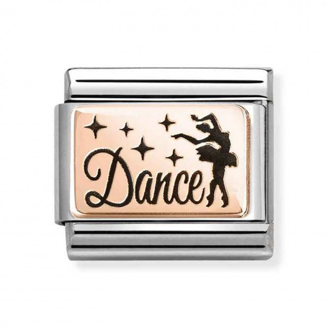 Original Nomination Classic Link in stainless steel and bonded 9ct rose gold decorated plate with a dancer and the word dance in black enamel. This is the perfect gift for someone who loves the world of dance.