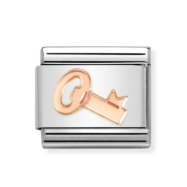 Original stainless steel Charm for Nomination's Composable Classic Bracelet with bonded rose gold Love symbols. Available in several versions. Made in Italy. Give the love of your life the key to your heart.