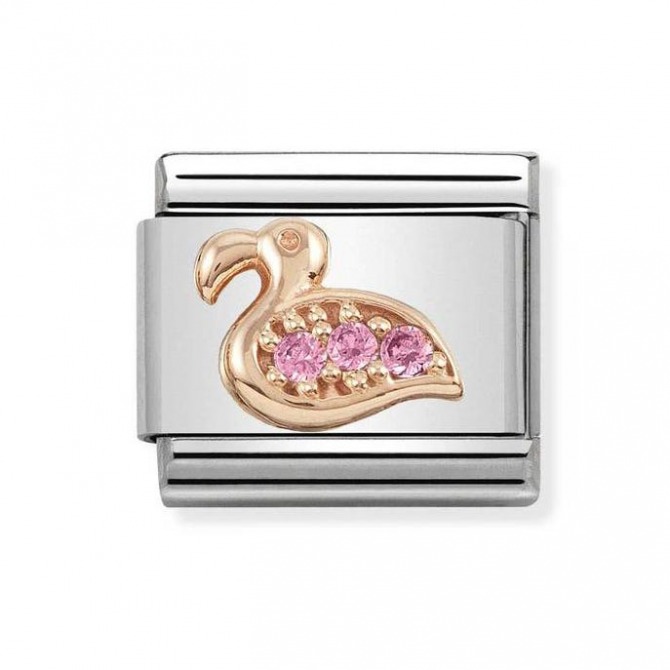 Stainless steel charm for original Nomination Composable Classic bracelet with Flamingo, details in bonded rose gold and pink Cubic Zirconia. Made in Italy. One of the trendiest symbols in an all pink version.