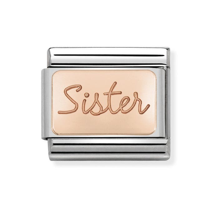 Original Charm for Nomination's Composable Classic bracelet in stainless steel and bonded rose gold with “Sister” engraved. Made in Italy. Is your sister your best friend and confidant? Dedicate this special Charm to her!