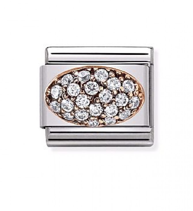 Original Nomination Charm for the Composable Classic bracelet with Dome with white Cubic Zirconia and bonded 9ct rose gold detailing. Made in Italy. For a romantic evening or party, this Charm adds an elegant, celebratory feel to your look.