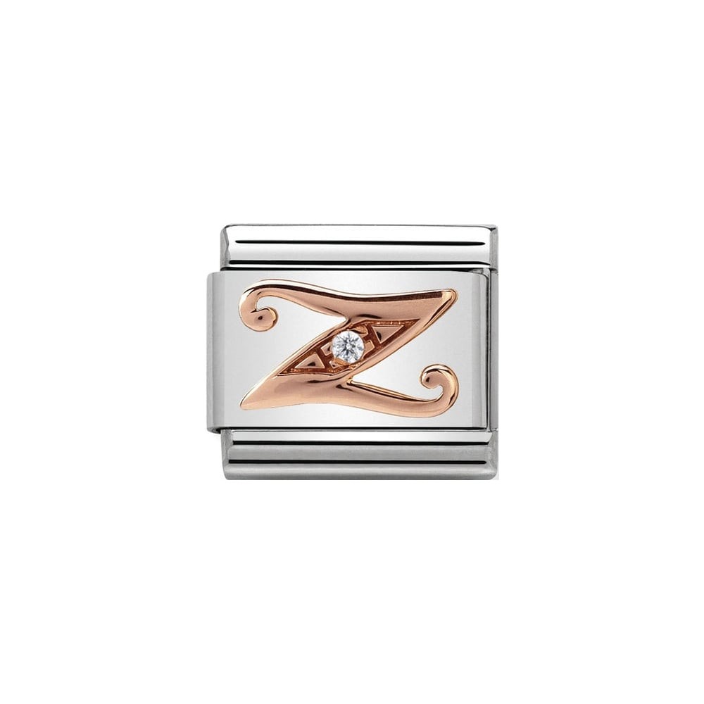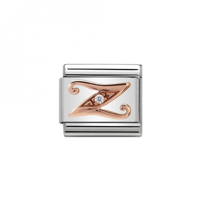 Original Charm for the Composable Classic bracelet with the Letter Z in stainless steel, 9K rose gold and white Swarovski Zirconia. Every letter of the alphabet is available. Made in Italy. Use letters to write out your message to someone special, and surprise them with Composable!