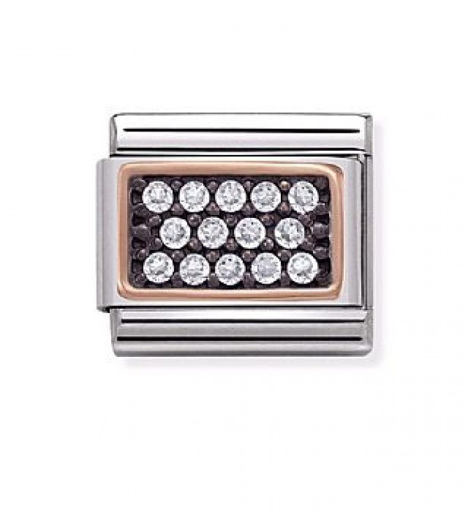 Original Nomination Charm in stainless steel with details in 9ct rose gold and white Swarovski Zirconia for the Composable bracelet. Made in Italy. A sparkling classic to glam up your everyday look.