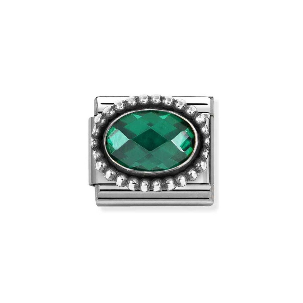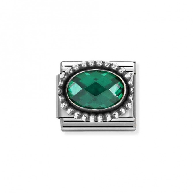 Nomination composable classic stones collection, stainless steel with oxidized silver beading surrounding a green oval faceted cubic zirconia charm.