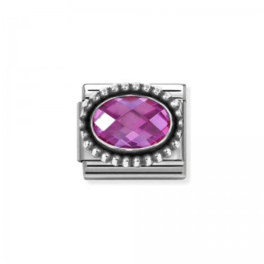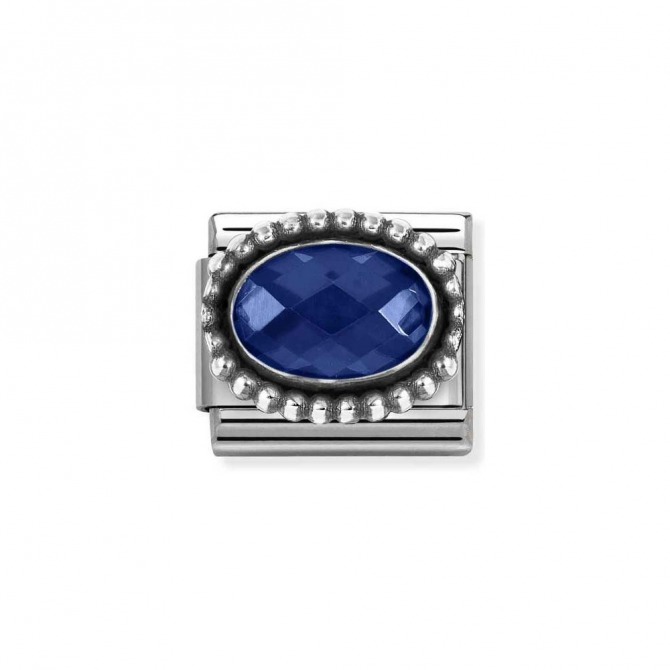 Nomination composable classic stones collection, stainless steel with oxidized silver beading surrounding a blue oval faceted cubic zirconia charm. Ideal as a September Birthday gift.