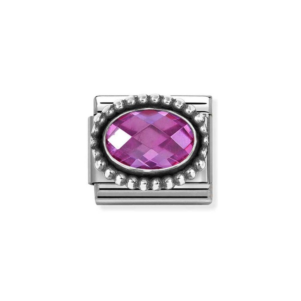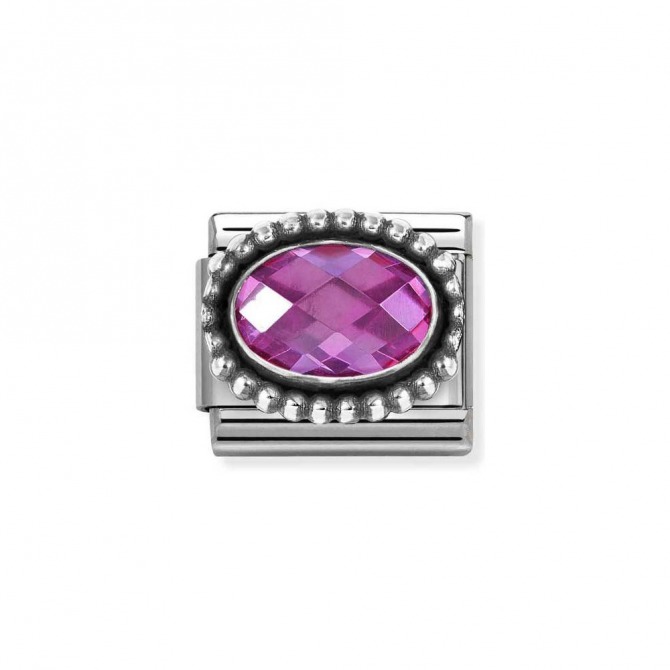 Nomination composable classic stones collection, stainless steel with oxidized silver beading surrounding a fuchsia pink oval faceted cubic zirconia charm.