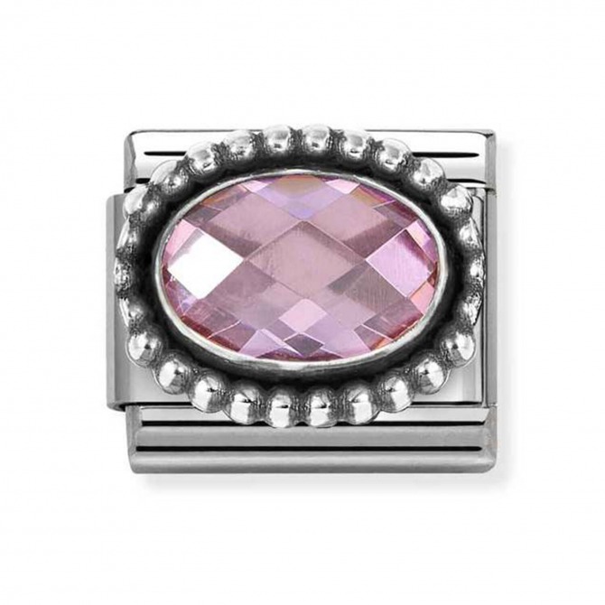 Nomination composable classic stones collection, stainless steel with oxidized silver beading surrounding a pink oval faceted cubic zirconia charm.