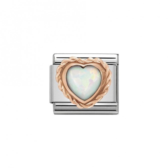 Original tile for Composable bracelet in Steel, rose gold and White opal, in the shape of a heart. Made in Italy. The link dedicated to love. Ideal for an October Birthday.