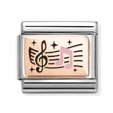 Link for Original Composable Classic Bracelet in Stainless Steel with Music Note symbols in bonded 9ct rose gold with black and pink enamel. Made in Italy. The perfect Link for all the rockers, the pop stars, the jazz aficionados - what ever beat you move to, add a Link to celebrate it on your bracelet!