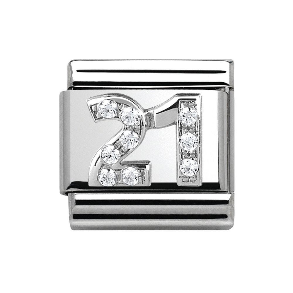 Composable Classic Charm for original bracelet in stainless steel, sterling silver and Cubic Zirconia with number twenty-one. Made in Italy. Celebrate this special occasion with a new link.