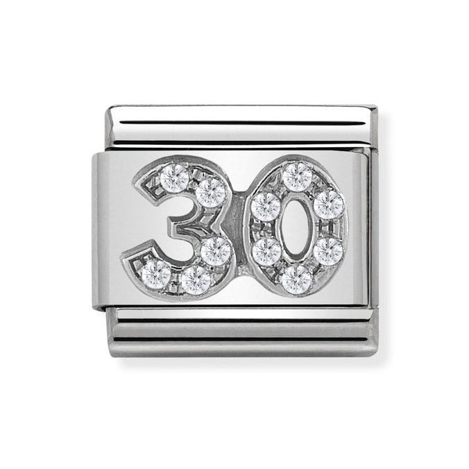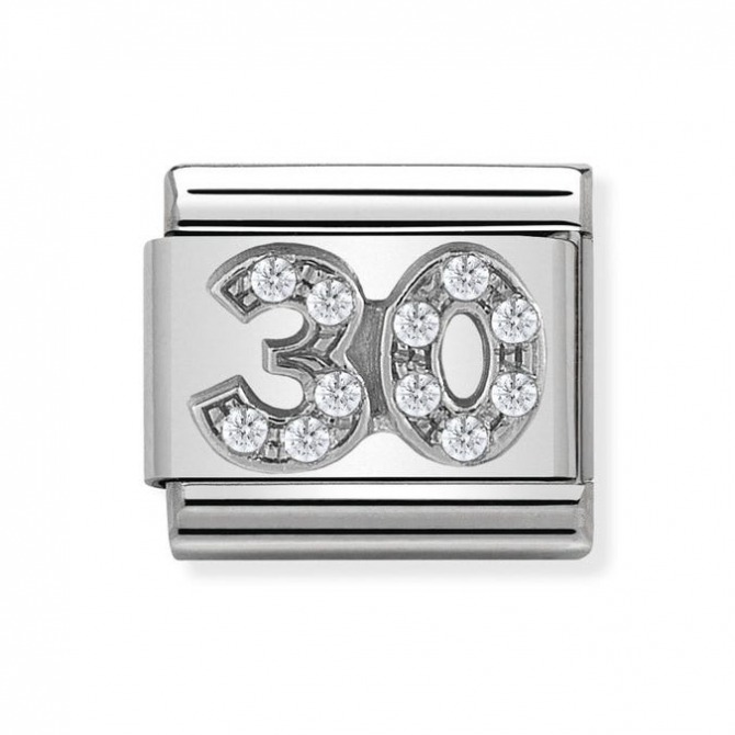 Original Charm for Nomination's Composable Classic bracelet in stainless steel with the Number 30 in sterling silver and white Cubic Zirconia. Made in Italy. Wish a good friend the very best on their 30th birthday with this special Charm!