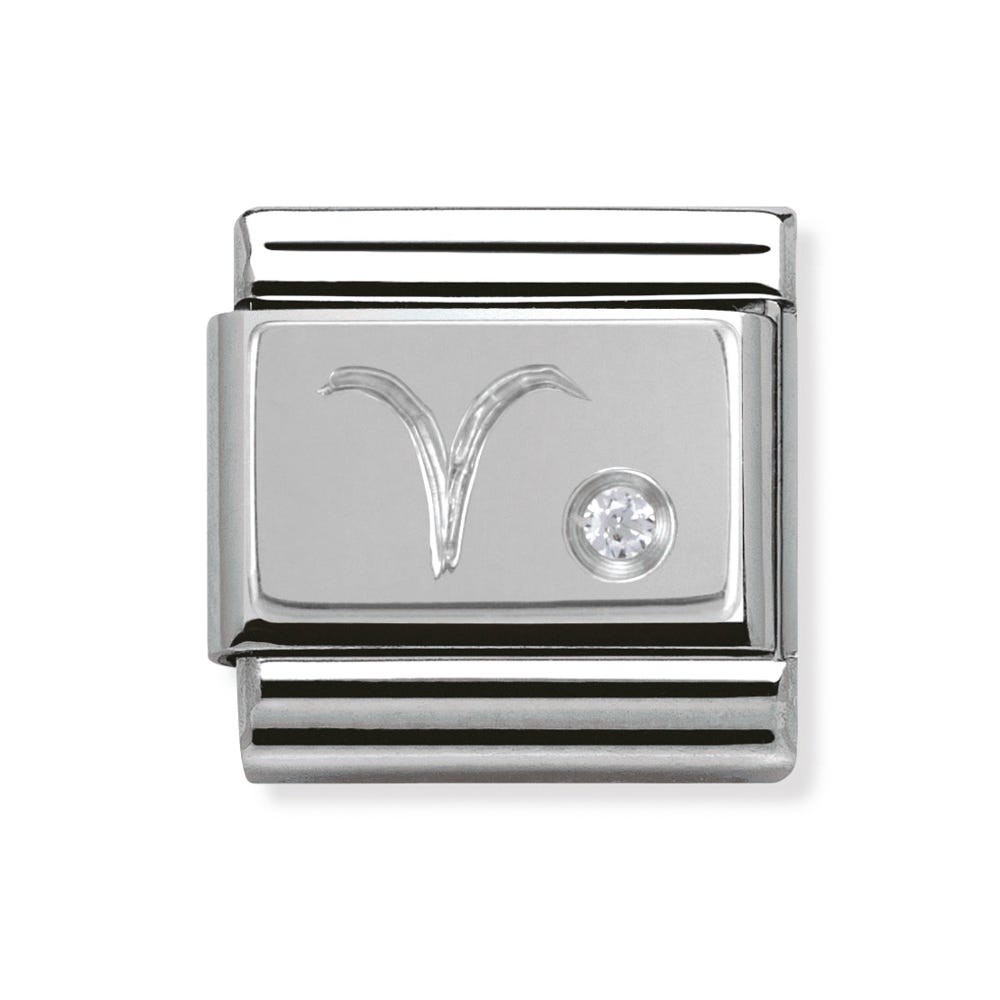 Original Zodiac Charm for Nomination's Composable Classic Bracelet with Aries symbol in stainless steel, sterling silver and Cubic Zirconia. All Zodiac symbols are available. Made in Italy. Aries is a fire sign: Brave, independent, enthusiastic.