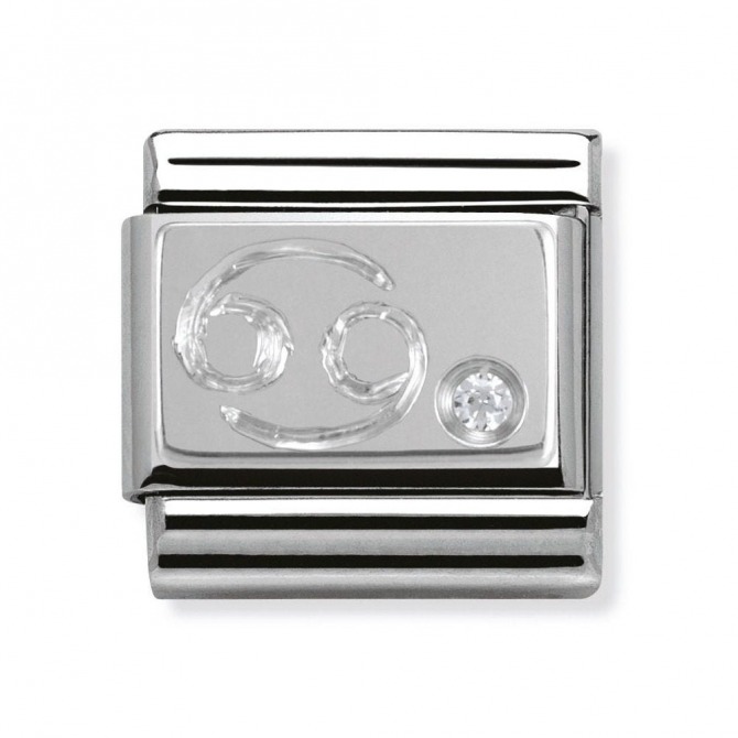 Original Zodiac Charm for Nomination's Composable Classic Bracelet with Cancer symbol in stainless steel, sterling silver and Cubic Zirconia. All Zodiac symbols are available. Made in Italy. Cancer is a water sign: Sensitive, friend-oriented, practical.