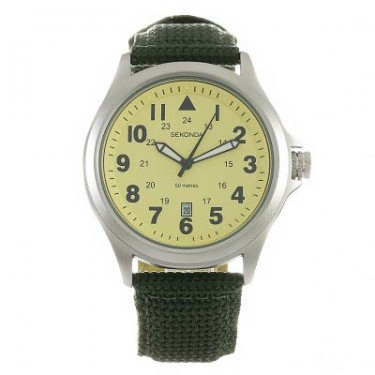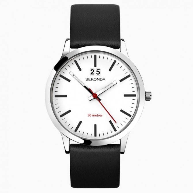 This minimalist watch features a silver coloured case housing a matte white dial with a date display. Fastened with a black, quick release, leather strap and is water resistant up to 50 metres.