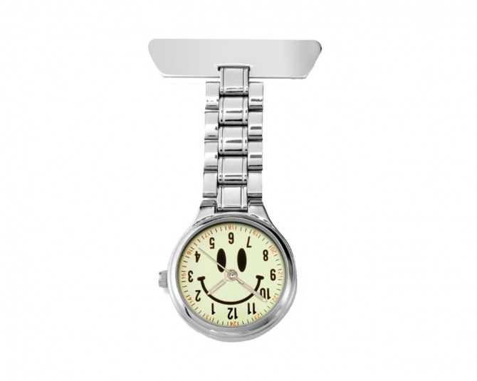This classic nurses watch features steel links which hold a luminescent smiley face dial and hands. The time is displayed using a 12hr format & suitable for wearing with scrubs.