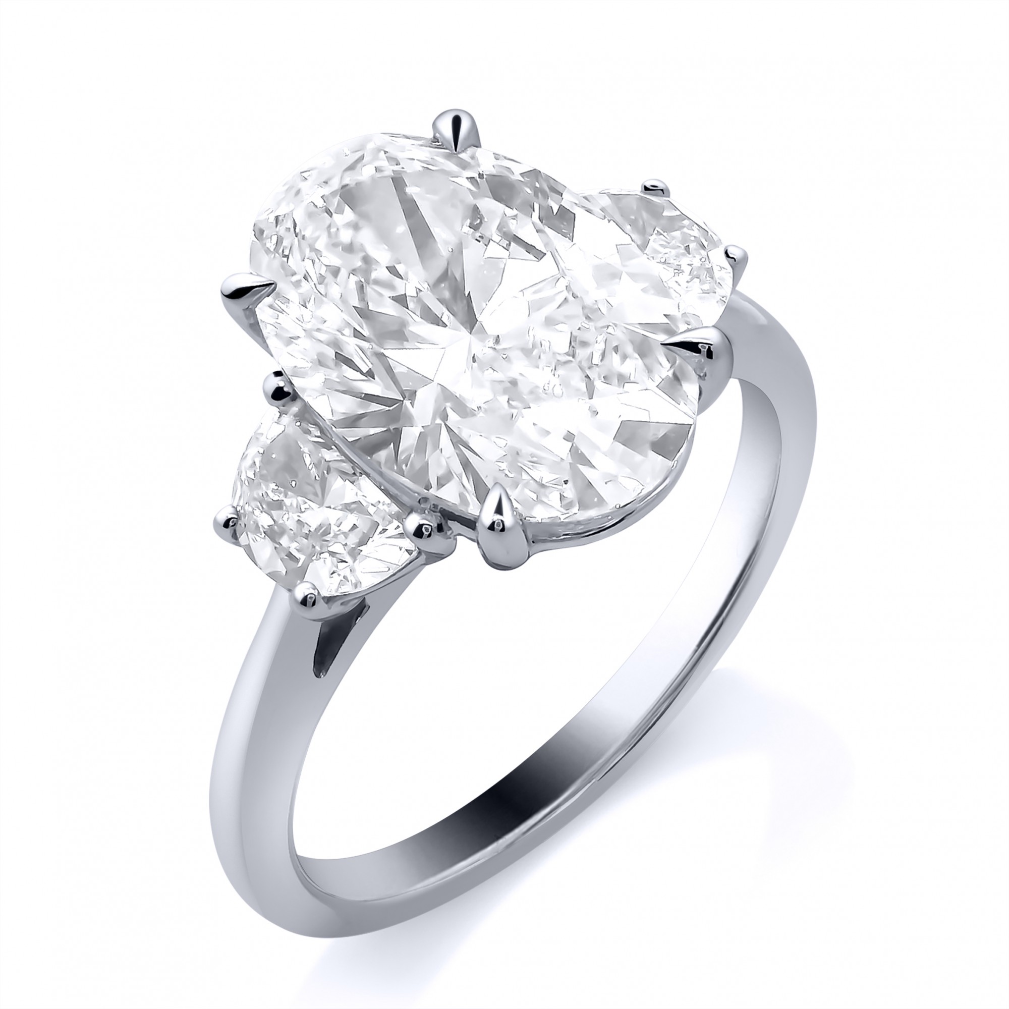 Oval cut lab grown diamond with two half moon side stones in a claw setting, mounted on a platinum ring. F. VS1 3.13ct.