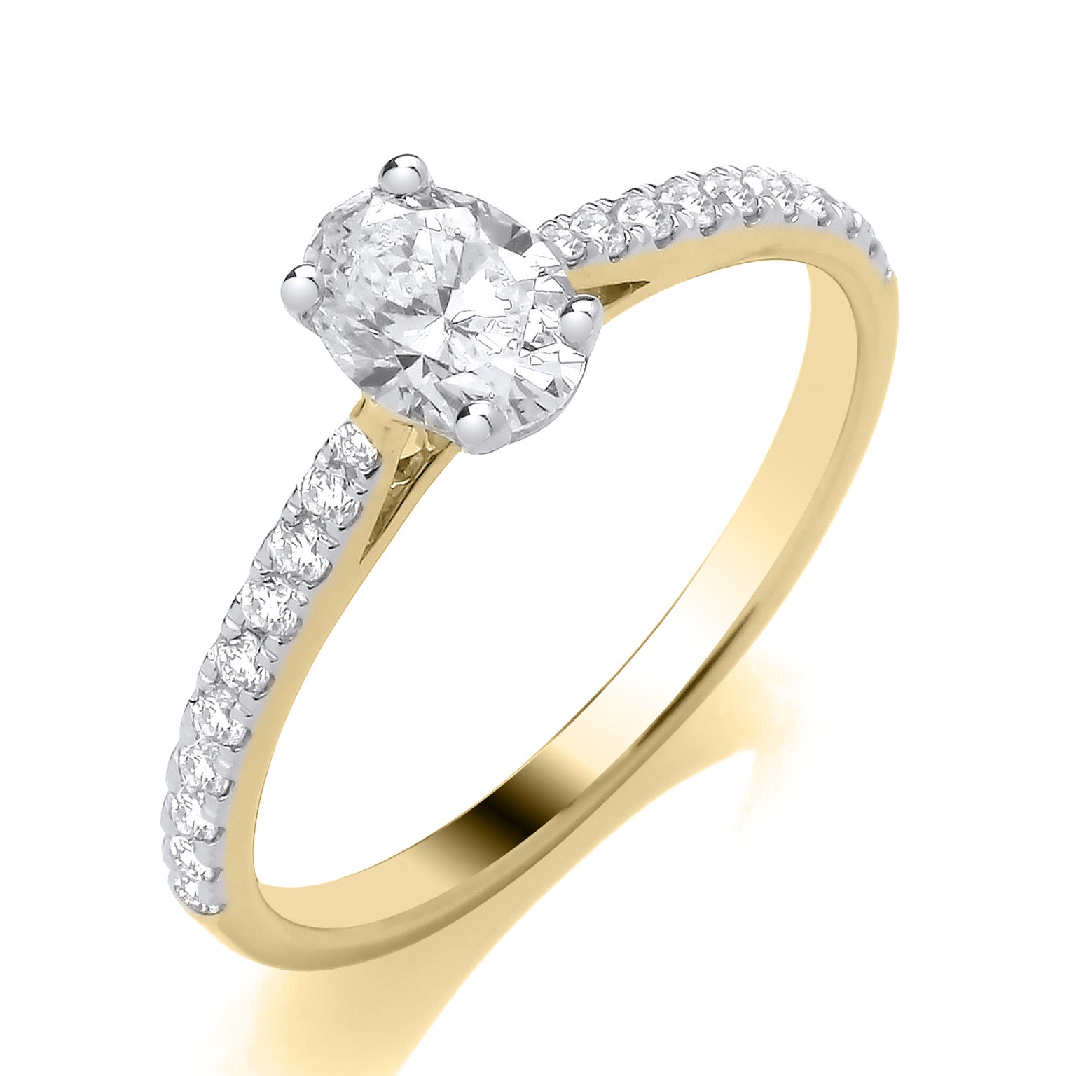 Oval cut lab grown diamond with stone set shoulders, mounted on a 9ct yellow gold ring. D-E. VS1 1.55ct + 0.11ct.