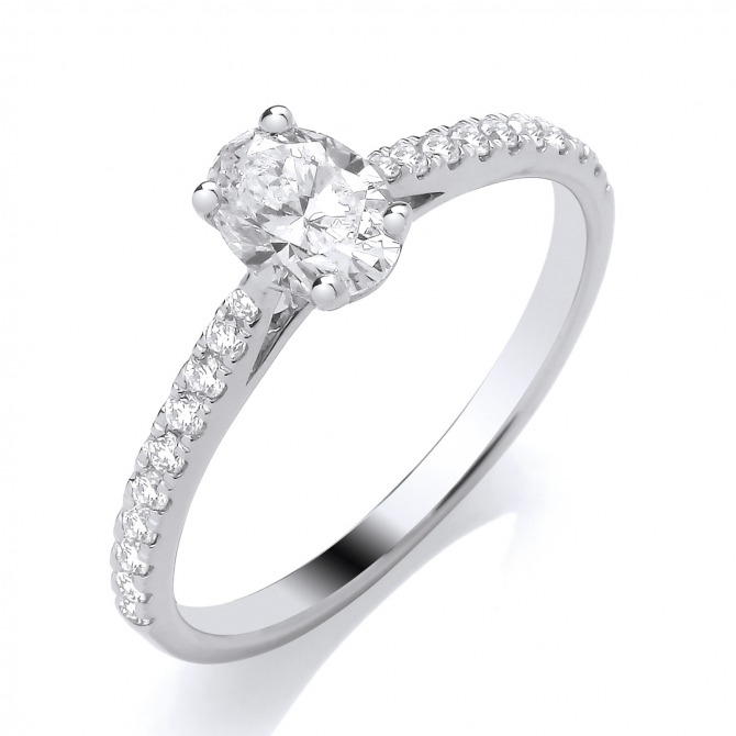 Oval cut lab grown diamond with stone set shoulders, mounted on a 9ct white gold ring. D-E. VS1 0.75ct.