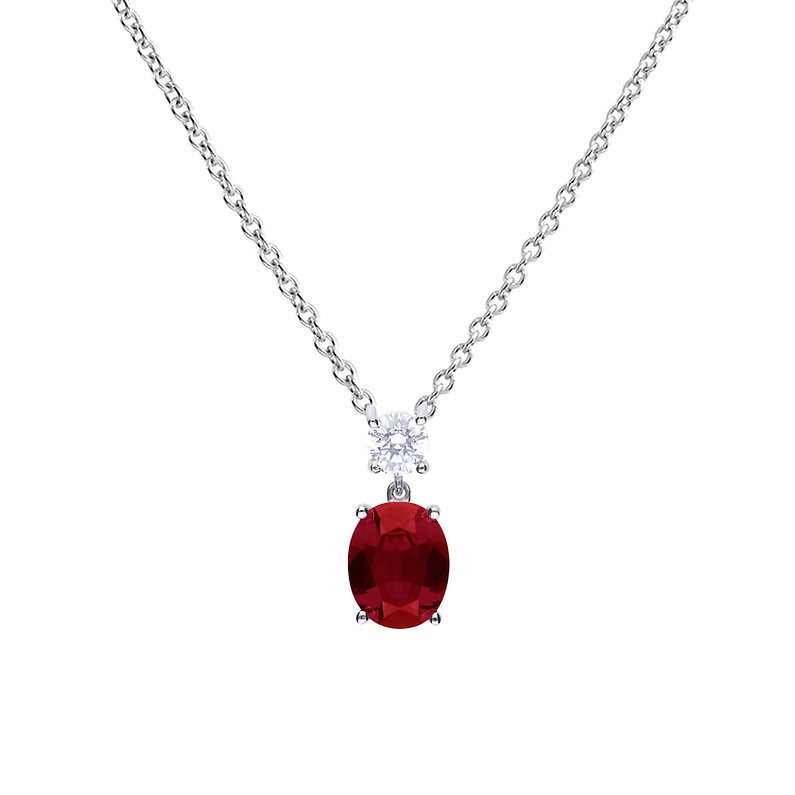 Silver & Oval Red Zirconia Drop Pendant Necklace