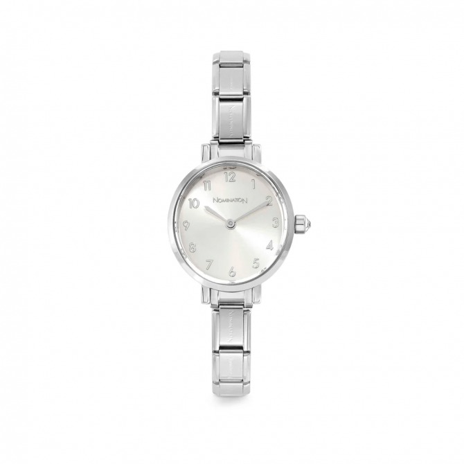 Stainless steel watch with Oval Sunray Silver dial and white Cubic Zirconia crown. Case size: 2.6 x 2.8 cm. Band width: 0.8 cm. Waterproof: 3 bars. You can personalise the watchband with original Composable Classic Links. Made in PRC. This watch is elegant and luminous, perfect for everyday where thanks to its versatility.