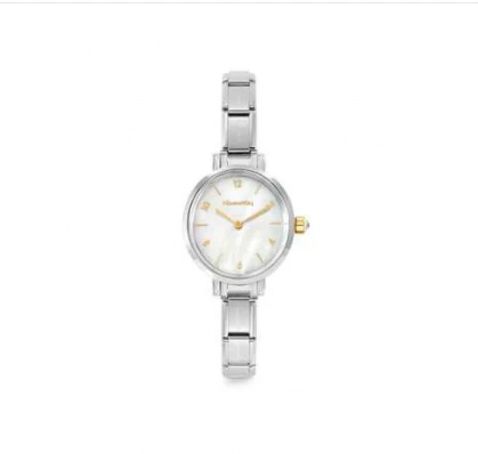 Stainless steel watch with Oval Mother of Pearl dial, gold pointers and white Cubic Zirconia crown. Case size: 2.6 x 2.8 cm. Band width: 0.8 cm. Waterproof: 3 bars. You can personalise the watchband with original Composable Classic Links. Made in PRC. This watch is elegant and luminous, perfect for everyday where thanks to its versatility.