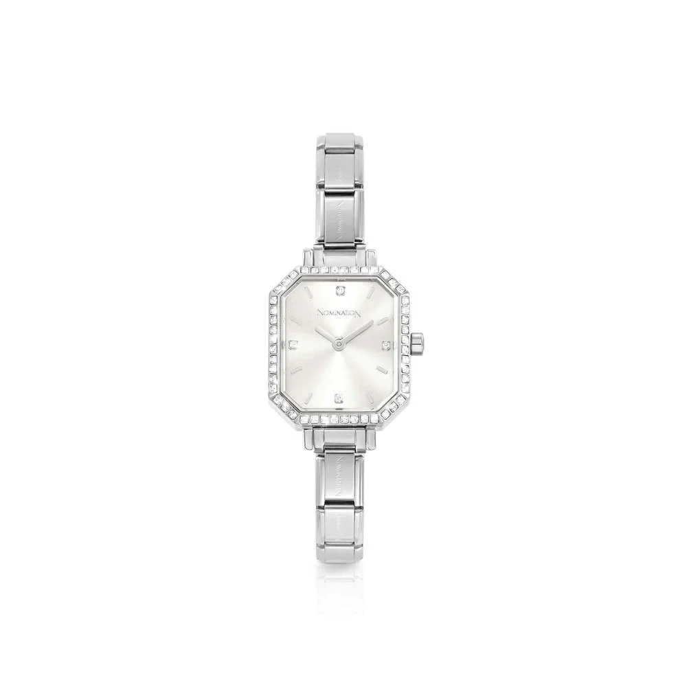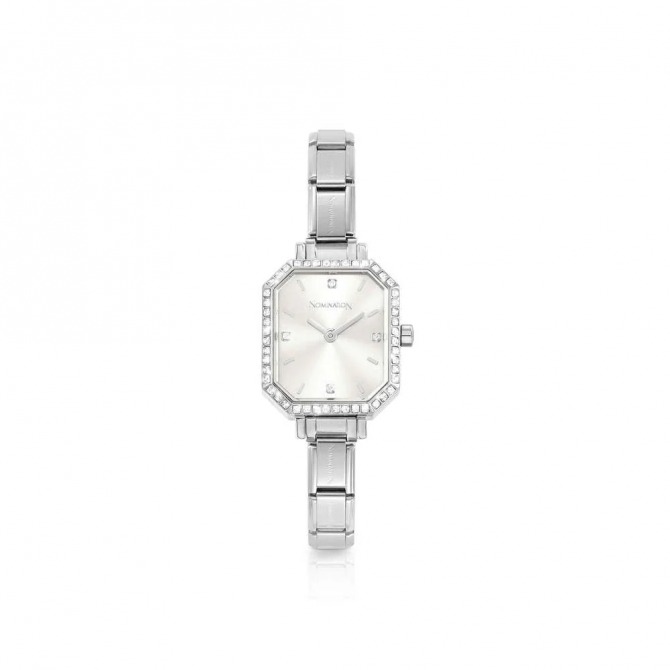 Stainless steel watch with white Cubic Zirconia. Band width: 0.8 cm. Stainless steel case and Sunray Silver dial. Waterproof: 3 bars. Case size: 2.3 x 2.7 cm. You can personalise the watchband with original Composable Classic Links.Made in PRC. The perfect gift for an elegant lady.