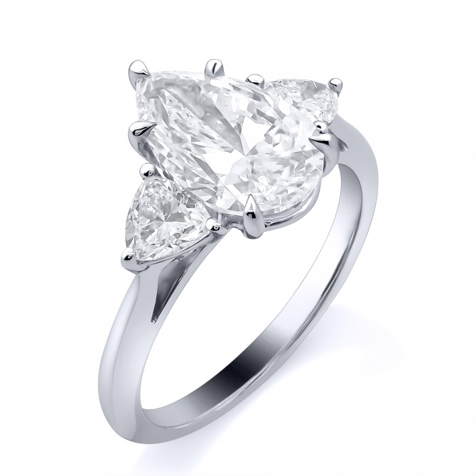 Pear cut lab grown diamond with two trilliant cut side stones in a claw setting, mounted on a platinum ring. F. VS1 2.09ct.