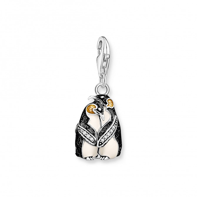 Love on ice: The charm pendant is made of slightly blackened 925 Sterling silver & designed in the shape of two emperor penguins, which are hugging each other. They are crafted in a 3D-illustration with delicately engraved lines and are painted by hand with black and yellow cold enamel. The wings of the penguins are decorated with small, white zirconia stones in the pavé style.