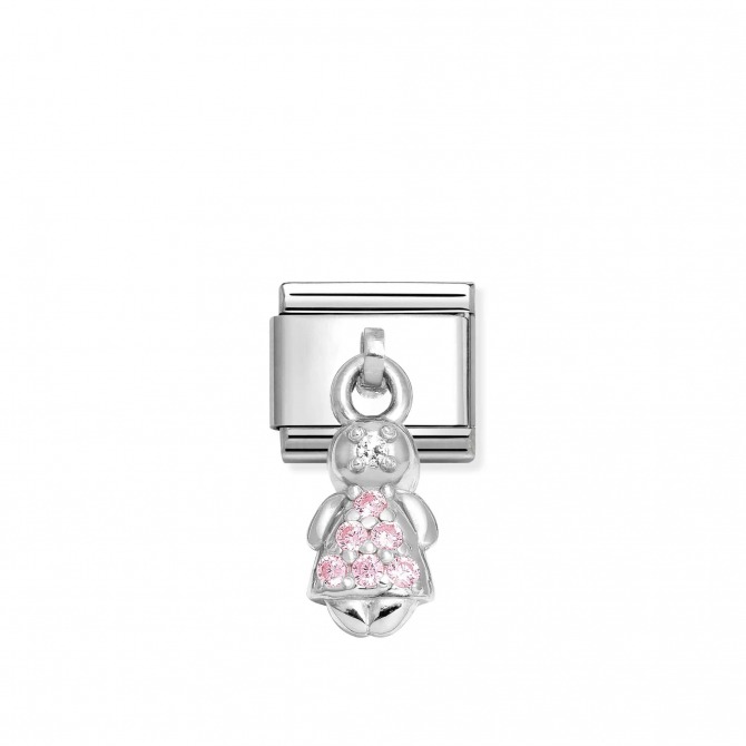Original Nomination Classic Link in stainless steel and sterling silver with Girl pendant symbol with Pink Cubic Zirconia. The coloured Cubic Zirconia used in this item may be subject to very slight variations in colour. Made in Italy. Choose this Link for your daughter or for you - it is a great keepsake to symbolise an unbreakable bond.