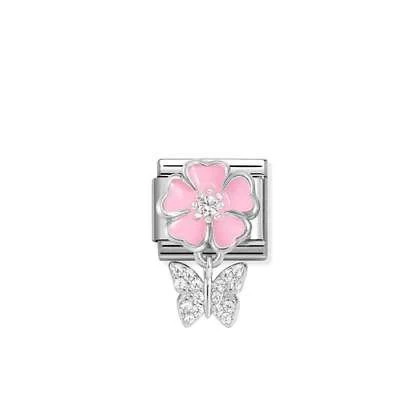 Original Nomination Classic Link in stainless steel with sterling silver Pink Flower with CZ and CZ Pavé Butterfly Pendant with White Cubic Zirconia. All the details on this jewel are finished by hand. Celebrate the arrival of Spring this new Composable Link.