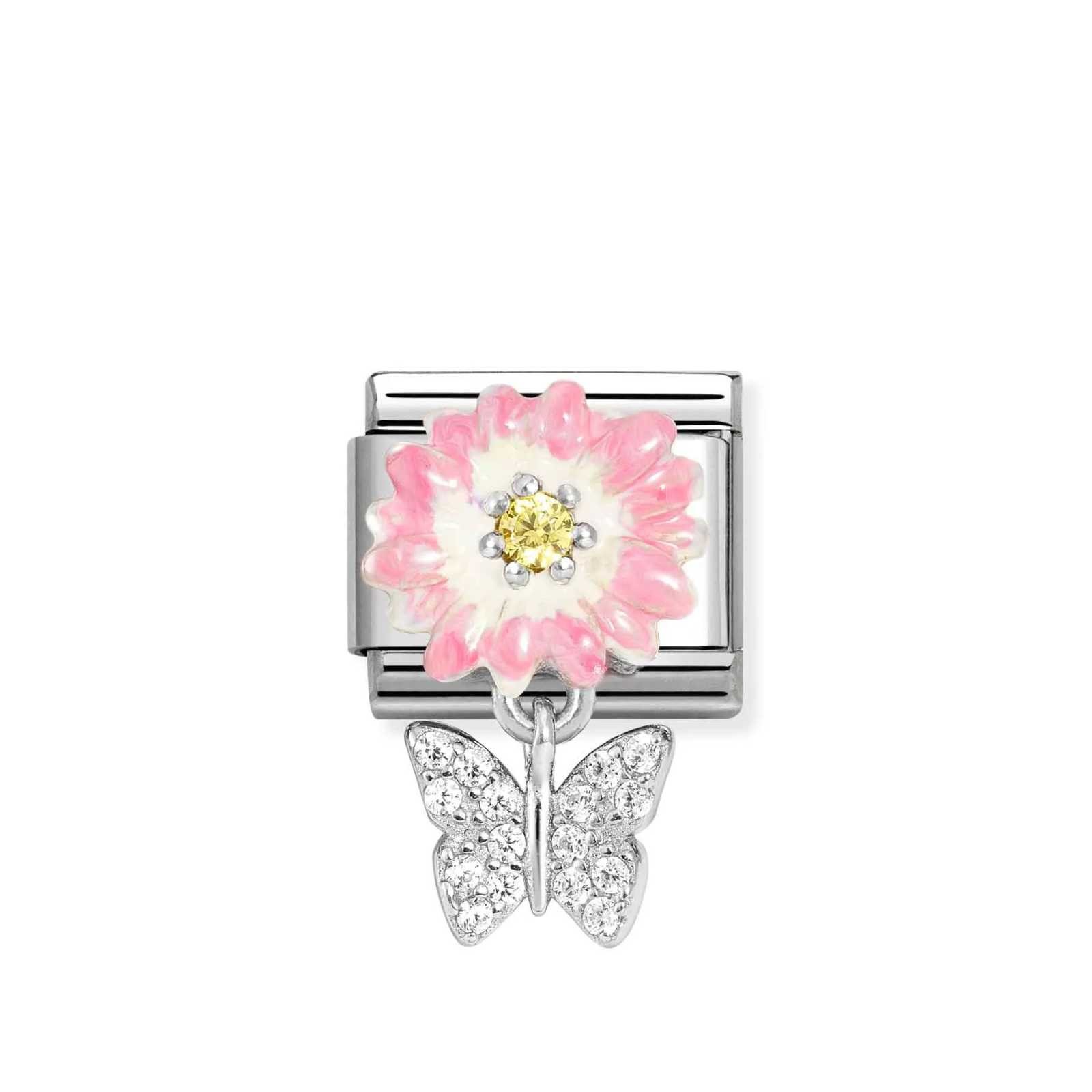 Original Nomination Classic Link in stainless steel with sterling silver Pink Flower with Yellow CZ and CZ Pavé Butterfly Pendant with White Cubic Zirconia. All the details on this jewel are finished by hand. This Link is the perfect gift for young person who is full of enthusiasm and Joie de vivre!