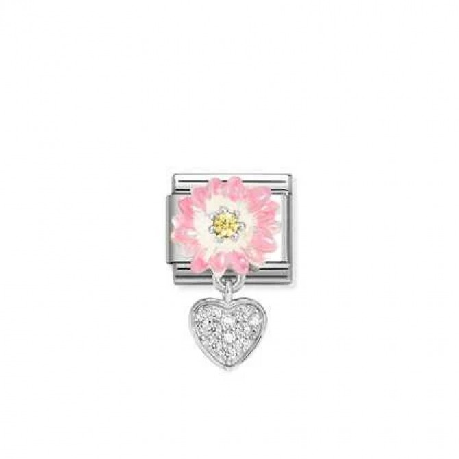 Original Nomination Classic Link in stainless steel with sterling silver Pink Flower with Yellow CZ and CZ Pavé Heart Pendant with White Cubic Zirconia. All the details on this jewel are finished by hand. This Link captures the beauty of Nature in a unique piece of jewellery.