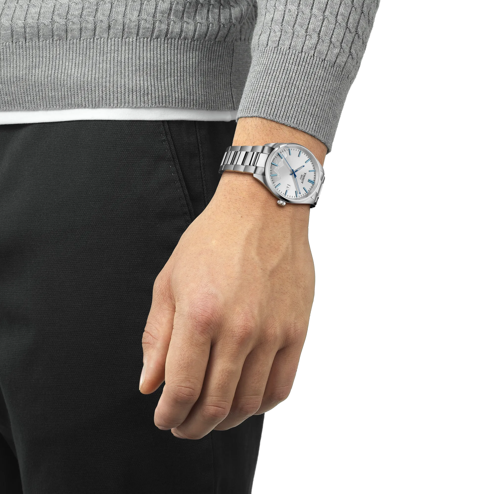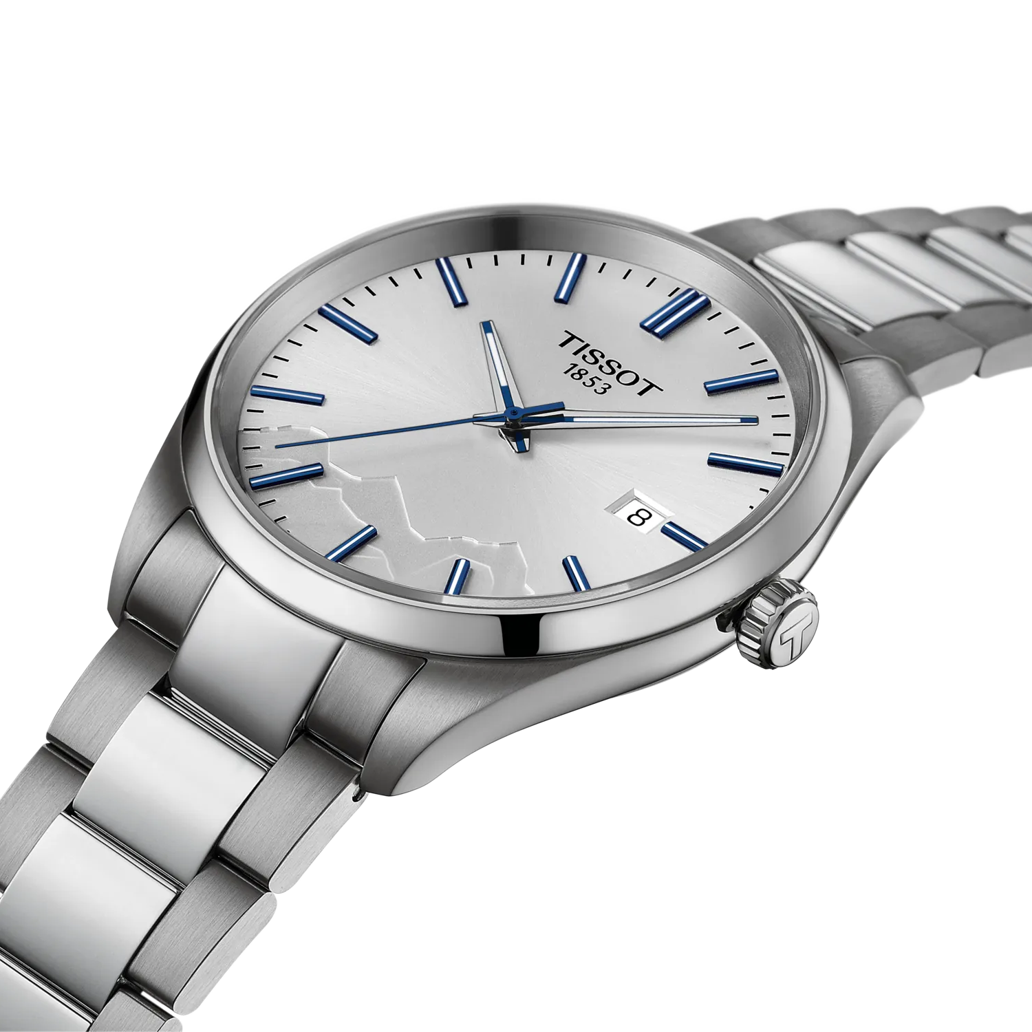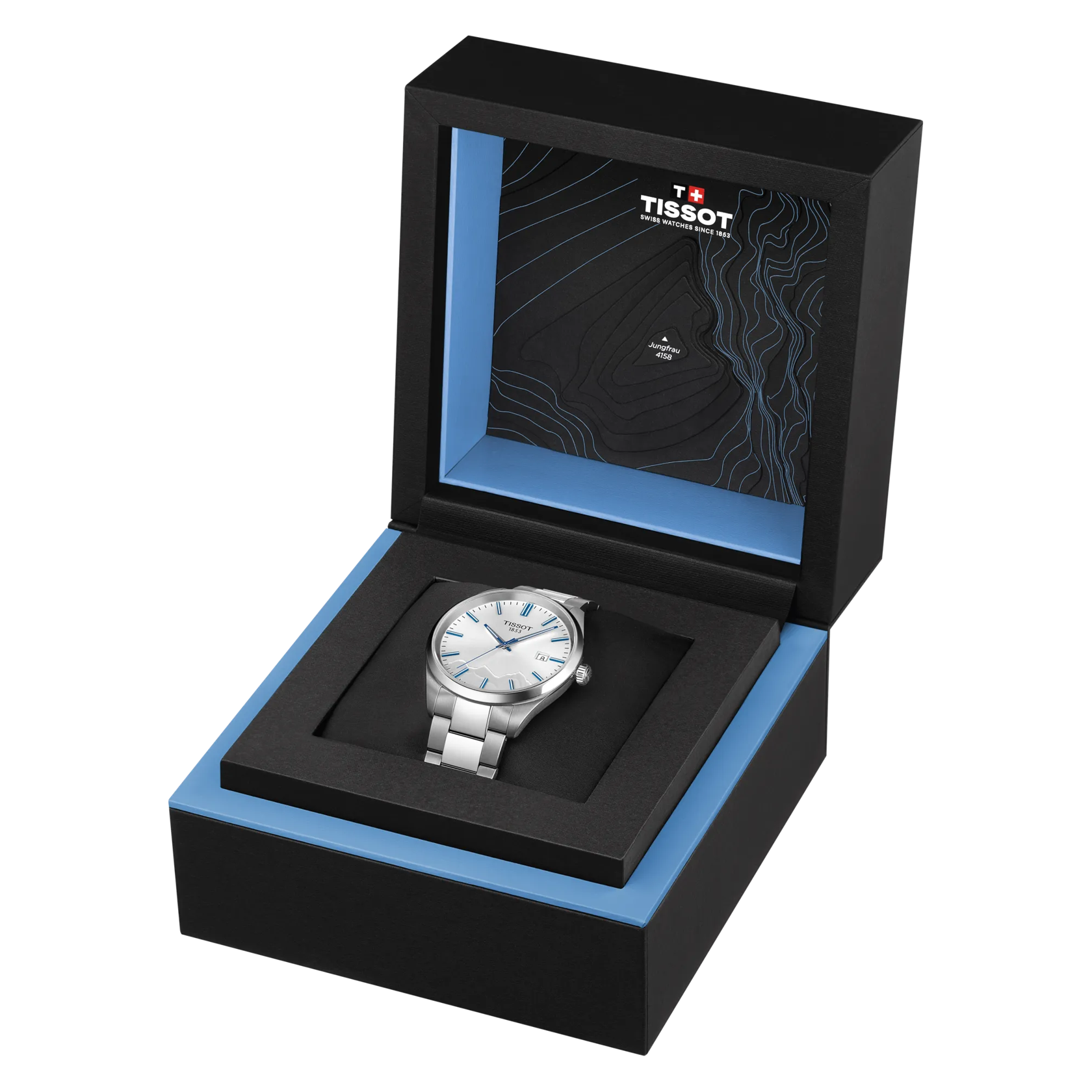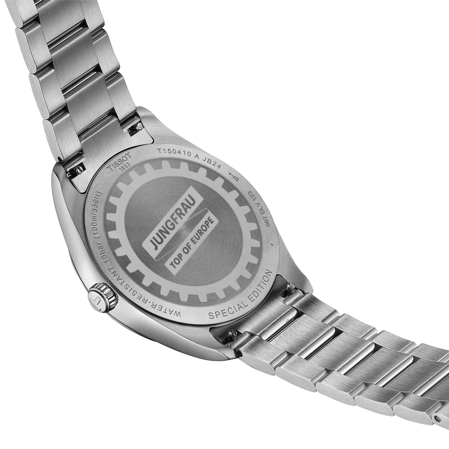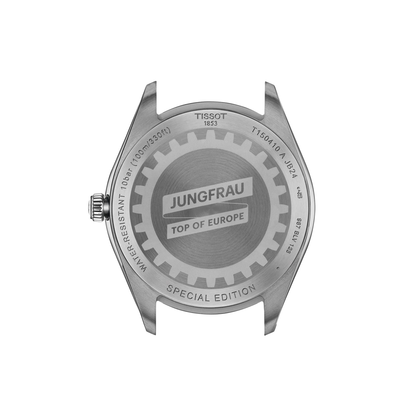 Tissot and Jungfrau celebrate Swiss heritage and their long-standing partnership with exclusive timepieces inspired by the untamed Alps and Swiss craftsmanship. At the meeting point of earth and sky, where the air thins out and the horizon stretches endlessly, time takes on a different rhythm—one captured in the PR 100 Jungfrau editions, powered by a reliable quartz movement. The Jungfrau mountains are delicately engraved on each dial, while the case back bears the inscription 'Jungfrau – Top of Europe,' marking their connection to this revered Swiss landmark. Discover this exclusive 40mm watch with its silver dial and blue indexes and hands.