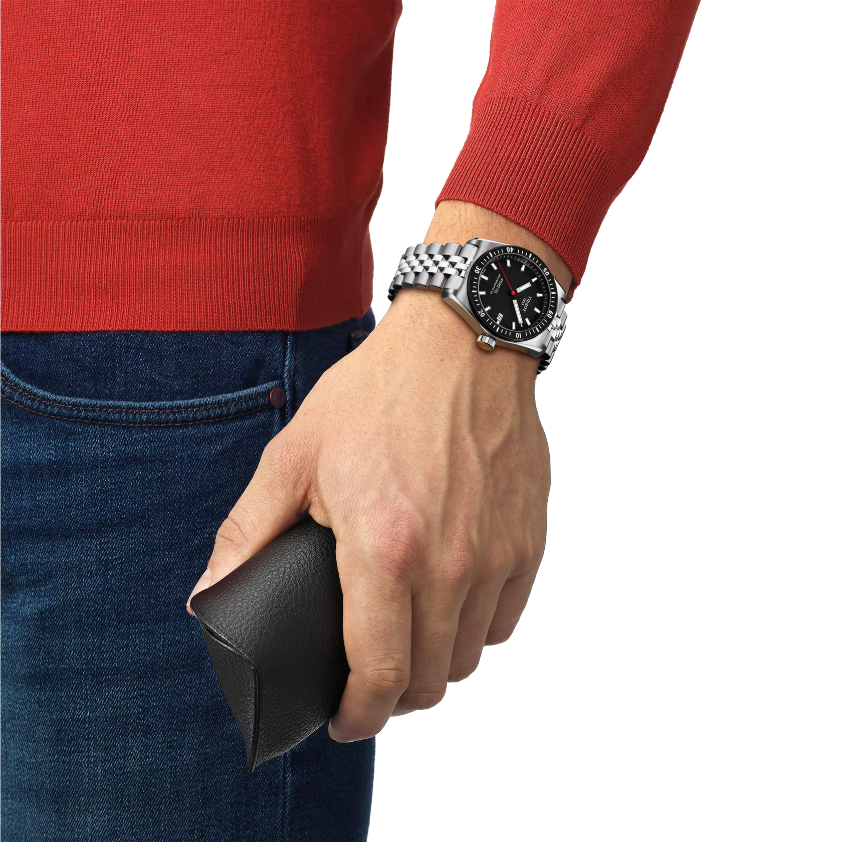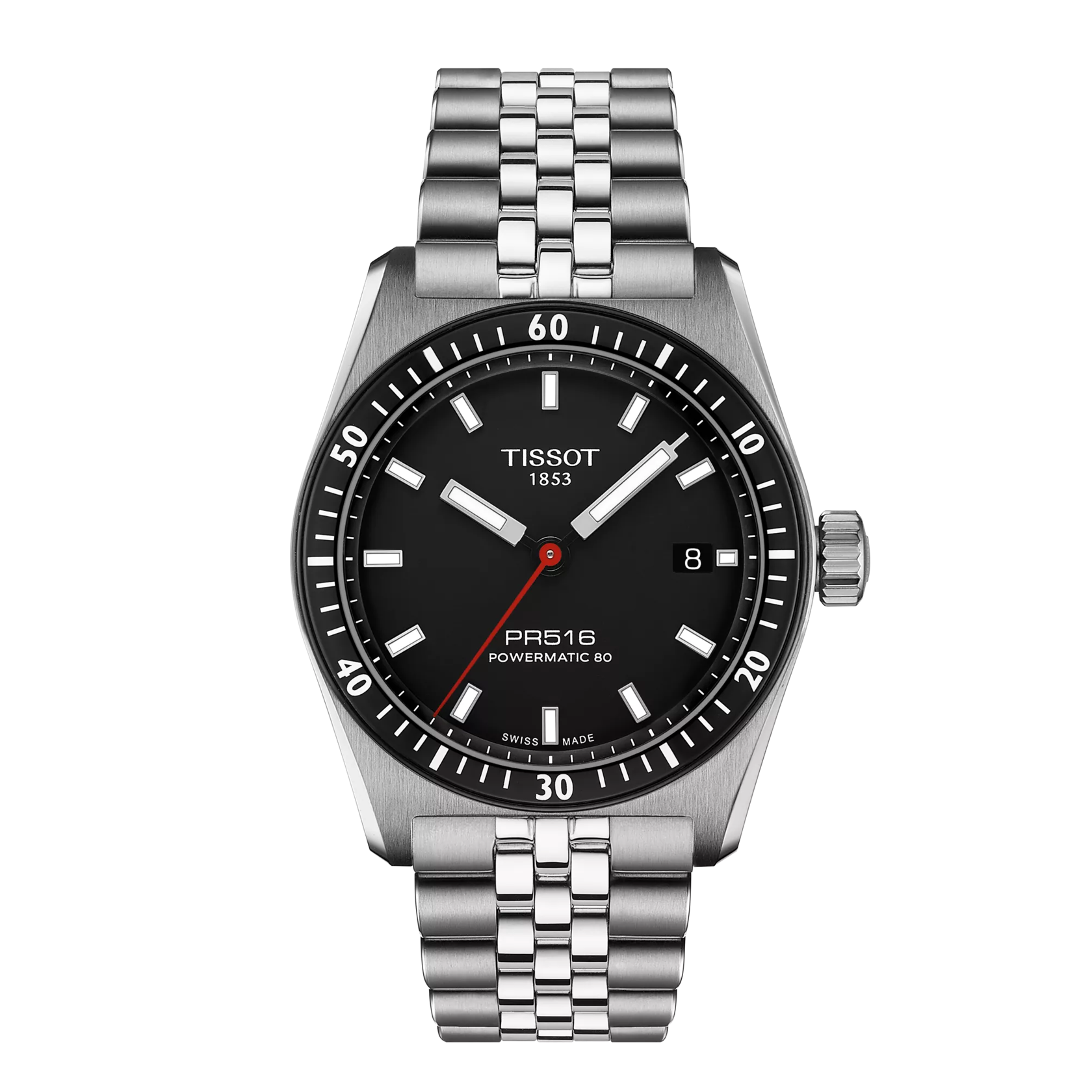 This 38mm watch features a sleek stainless steel case & a sporty dial, embodying the spirit of speed and precision. Powered by a Powermatic 80 movement, the new PR516 Powermatic 80 offers unmatched accuracy for an active lifestyle. Super-LumiNova®️-coated indexes ensure visibility in all conditions. The versatile design of this sporty watch is complemented by a quick interchangeable bracelet system, perfect for transitioning from business meetings to casual outings. This PR516 Powermatic is a modern classic, showcasing Tissot’s rich heritage with its black dial and bezel and its two-toned stainless steel bracelet.
