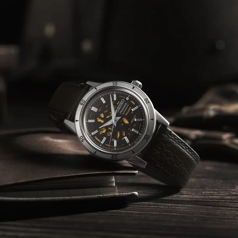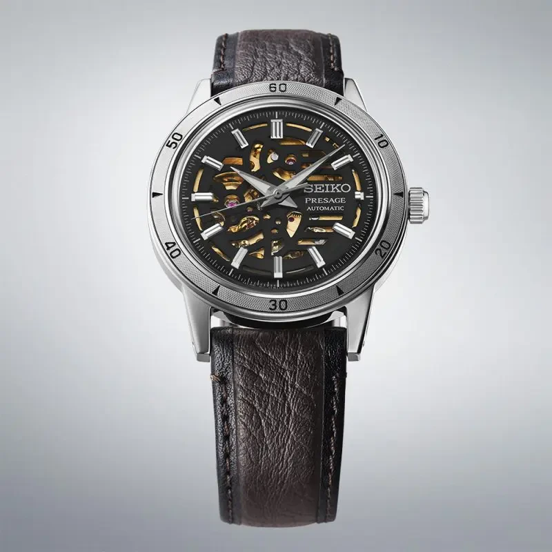This Presage Style 60s is inspired by Sixties biker looks with a cutout dial pattern resembling a vintage motorcycle engine and its inner workings.