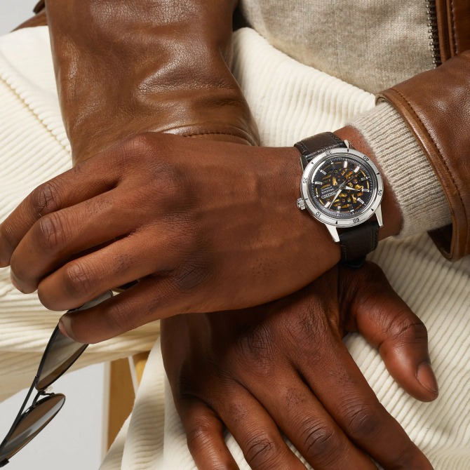 Under the theme of ‘Elegant Yet Rugged,’ the design of this watch channels a strong dress style – a characteristic look of the 60s embodied in films from the time. The charcoal grey metal dial adds to the allure of the decorative gold-coloured movement beneath.