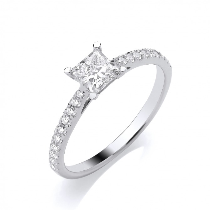 Princess cut lab grown diamond with stone set shoulders, mounted on a 9ct white gold ring. D-E. VS1 0.75ct.