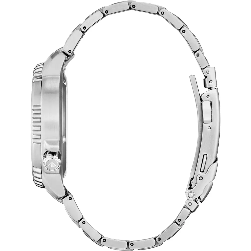 A deep dive into style with the Citizen Promaster Diver. The robust 44mm silver-tone stainless steel exterior has an easy-grip dive bezel and crown at 4 o’clock, with the bold design secured to the wrist via a matching silver-tone stainless steel bracelet. The sunray-textured, grey dial features oversized luminous hands and markers, for easy readability in lowlight. Additional features include date display at the 4 o’clock position. Maintaining the robust standards of the Promaster Collection, the timepiece is water resistant up to 200 metres. Sustainably powered by Citizen’s proprietary Eco-Drive technology.